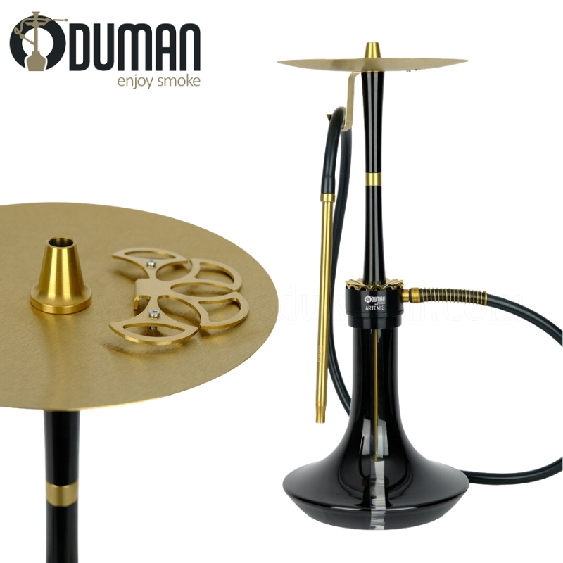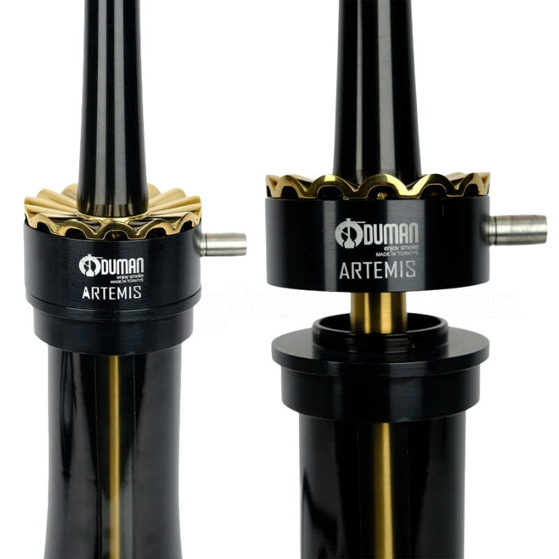 Ürünlerimizin tamamı orijinal ve faturalıdır. Duman ve su ile temas eden bütün kısımlar kaliteli çelik ve anodize edilerek gold renk eloksal kaplanan alüminyum parçalardan oluşan Artemis nargile takımı büyük boy olup hem cafe hem de heybetli nargile seven nargile severler için standart boy olarak üretilmiştir. Duman tahliye esnasında dumanı tüm yönlere yayan çiçek yaprağına benzeyen tahliye çıkışı ile 360° etkileyici bir tahliye efekti sunmaktadır. Tepsi üzerindeki hava kanallı kömür ızgara yeri, kömürlerin söndürülmeden bekletilebilmesi için tasarlanmıştır.